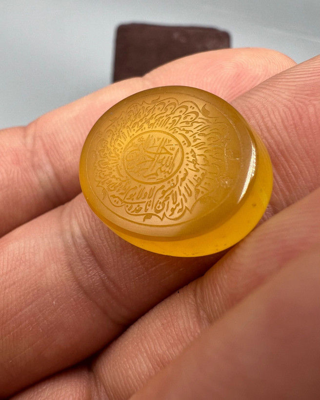 عقیق زرد حکاکی شده ای که میتونید برای ساخت انواع زیورآلات نقره استفاده کنید و از خواص عقیق و این آیه شریفه استفاده کنید