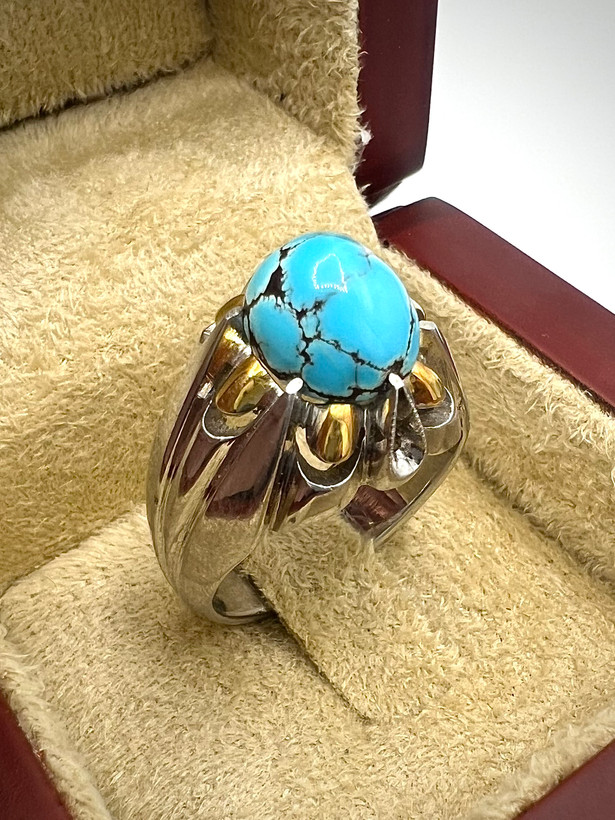 این انگشتر فیروزه با اره کاری منظم و آبکاری طلا نمای عالی داخل دست داره هرچند که دارای خواص فوق العاده فیروزه هم هست ازجمله افزایش رزق و روزی، افزایش آرامش، انرژی مثبت و...