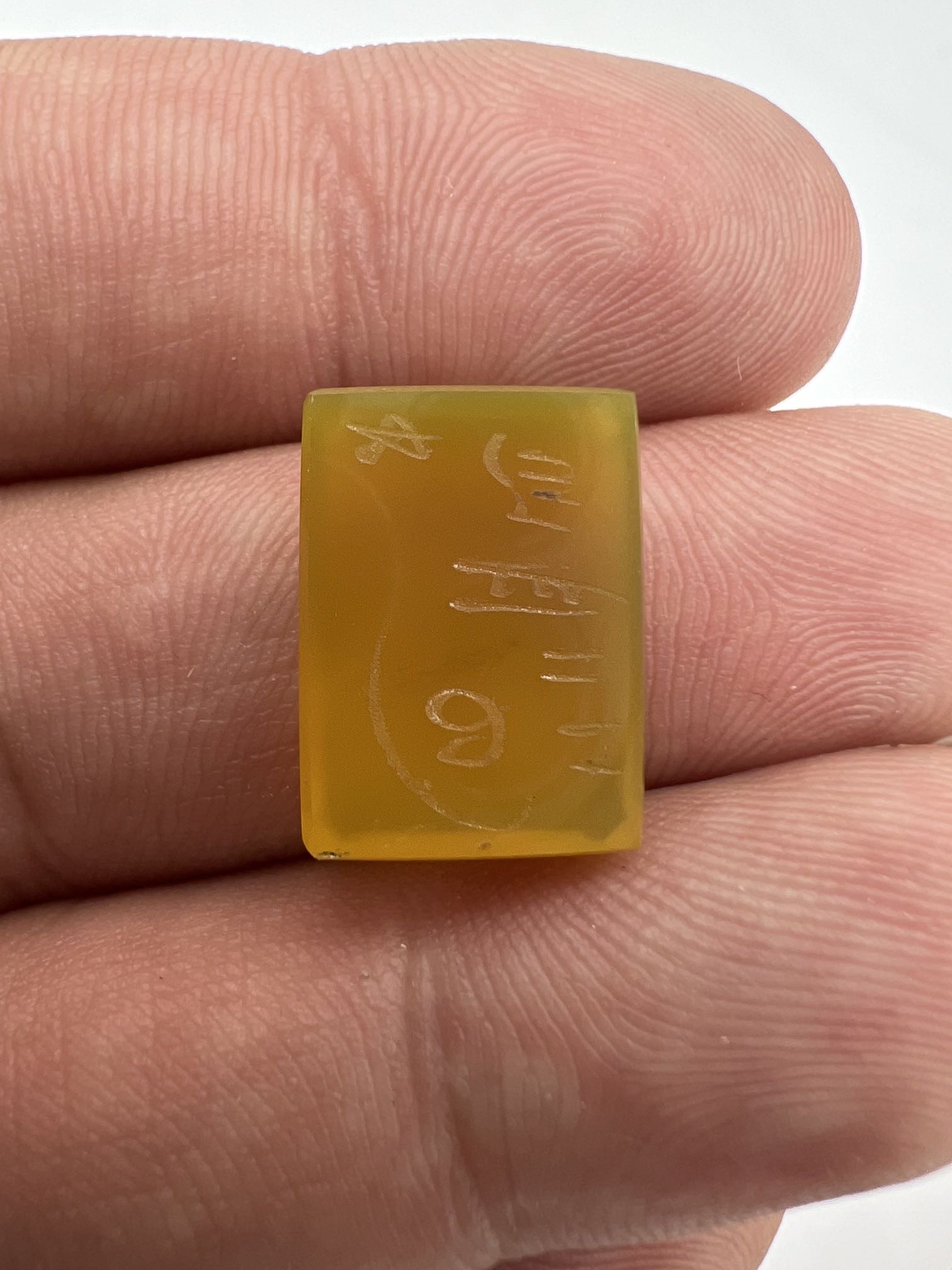 سنگ عقیق زرد خوشرنگ رو مشاهده میکنید که دعای شرف الشمس پشت آن حکاکی شده
