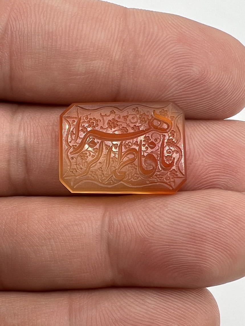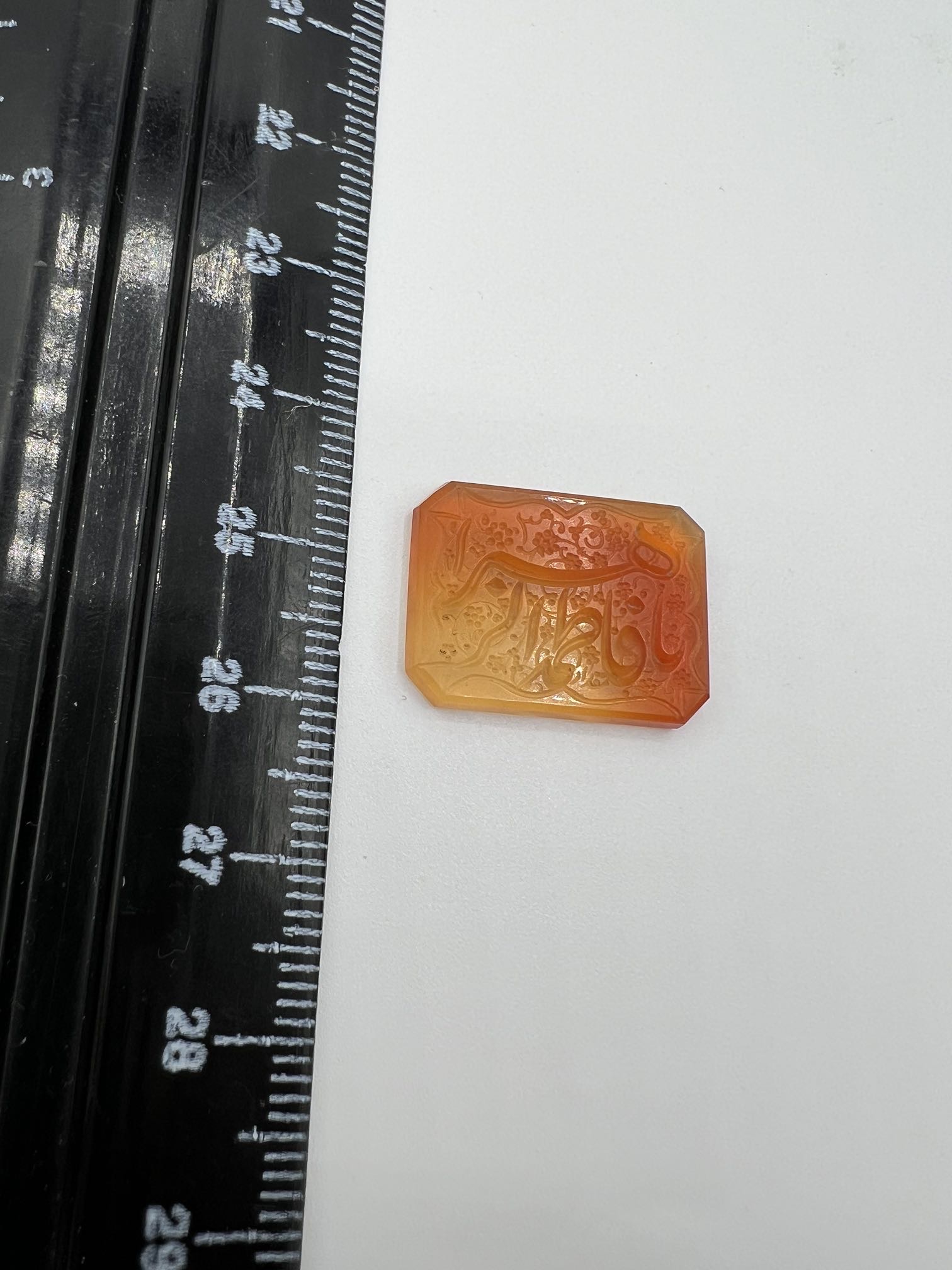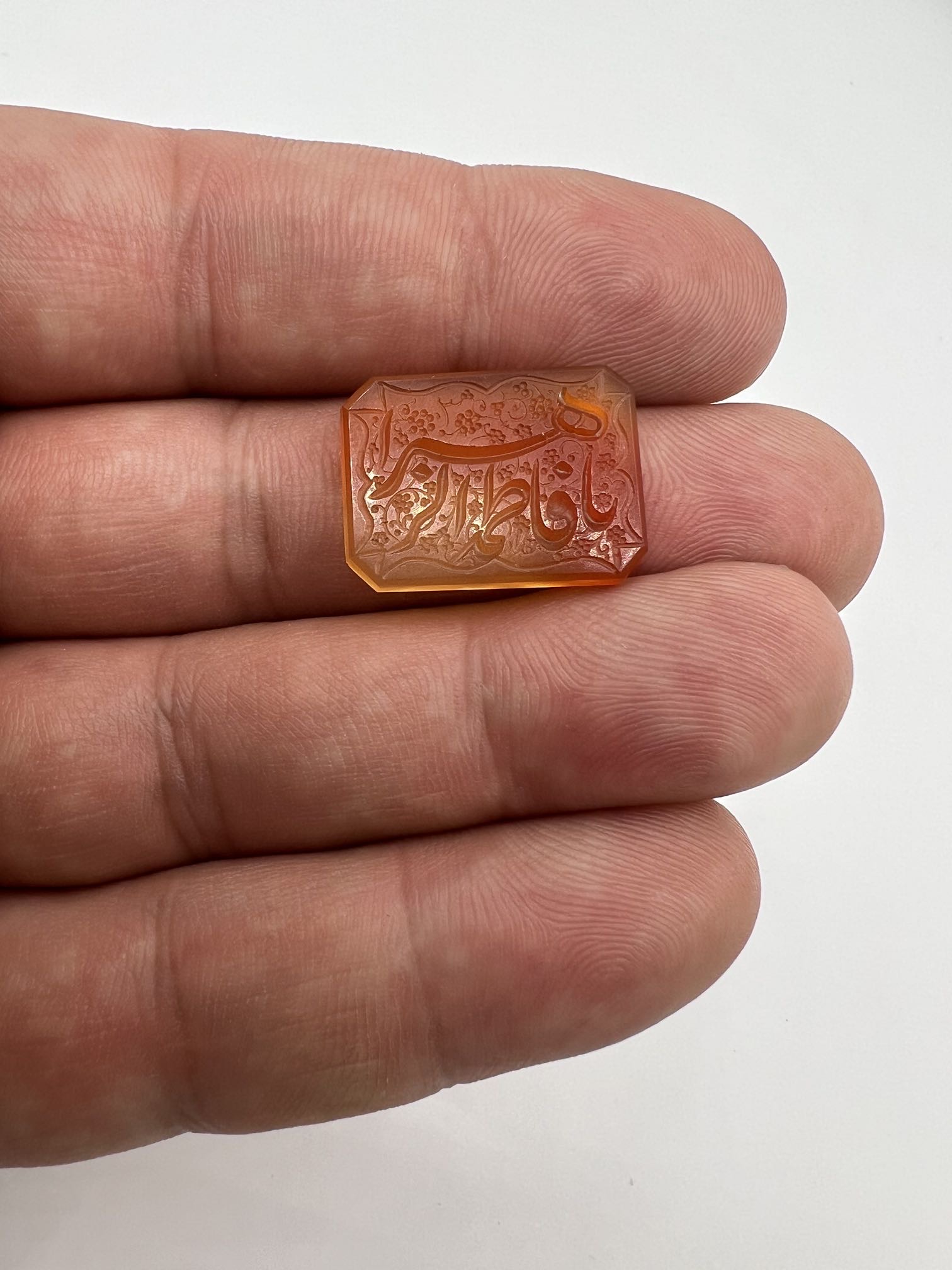 یا فاطمه الزهرا سلام الله علیها ذکر مقدس بانوی دوعالم که روی عقیق دورنگ با تراش تحت حکاکی شده