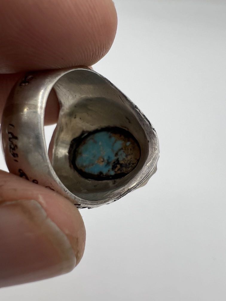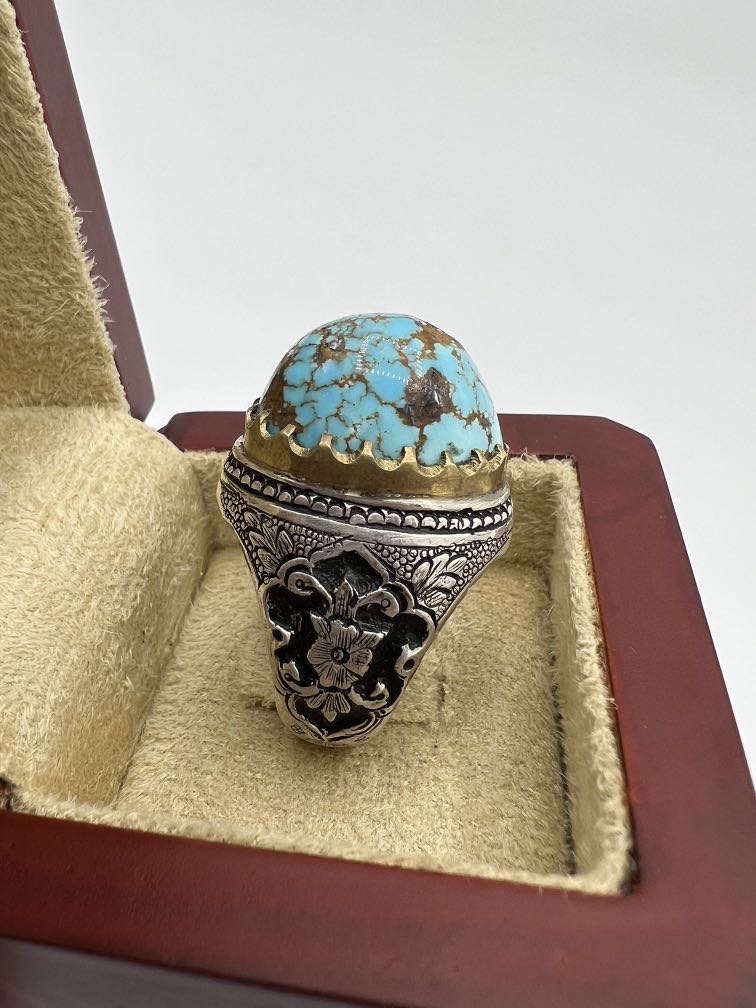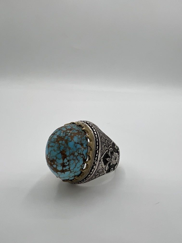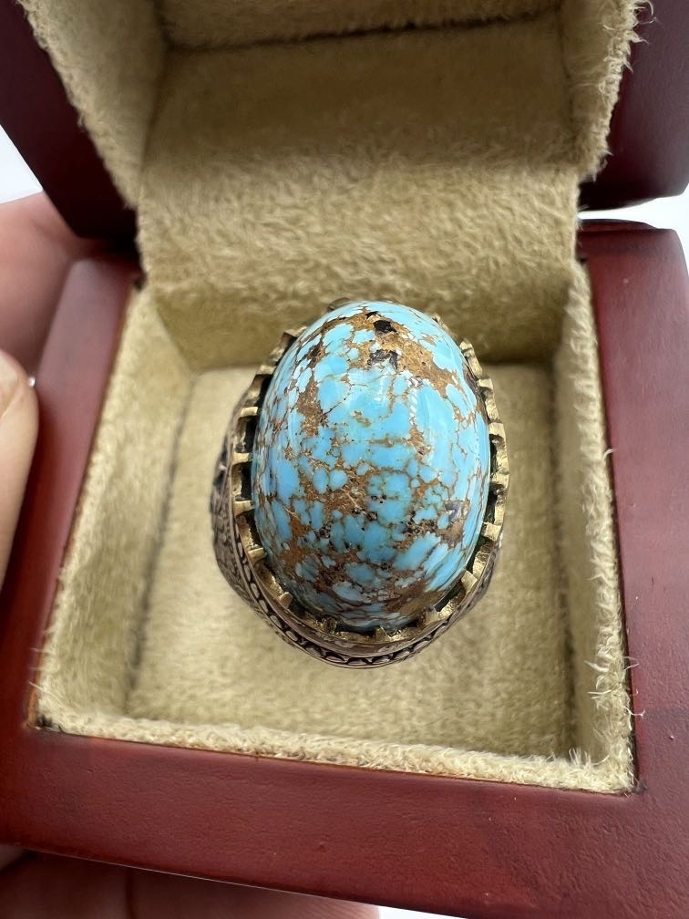 انگشتری مردانه با یه نگین شجری رگه طلایی رو مشاهده میکنید، نگینی که از مغز سنگ فیروزه هست ، خوشرنگ با رگه های جذاب