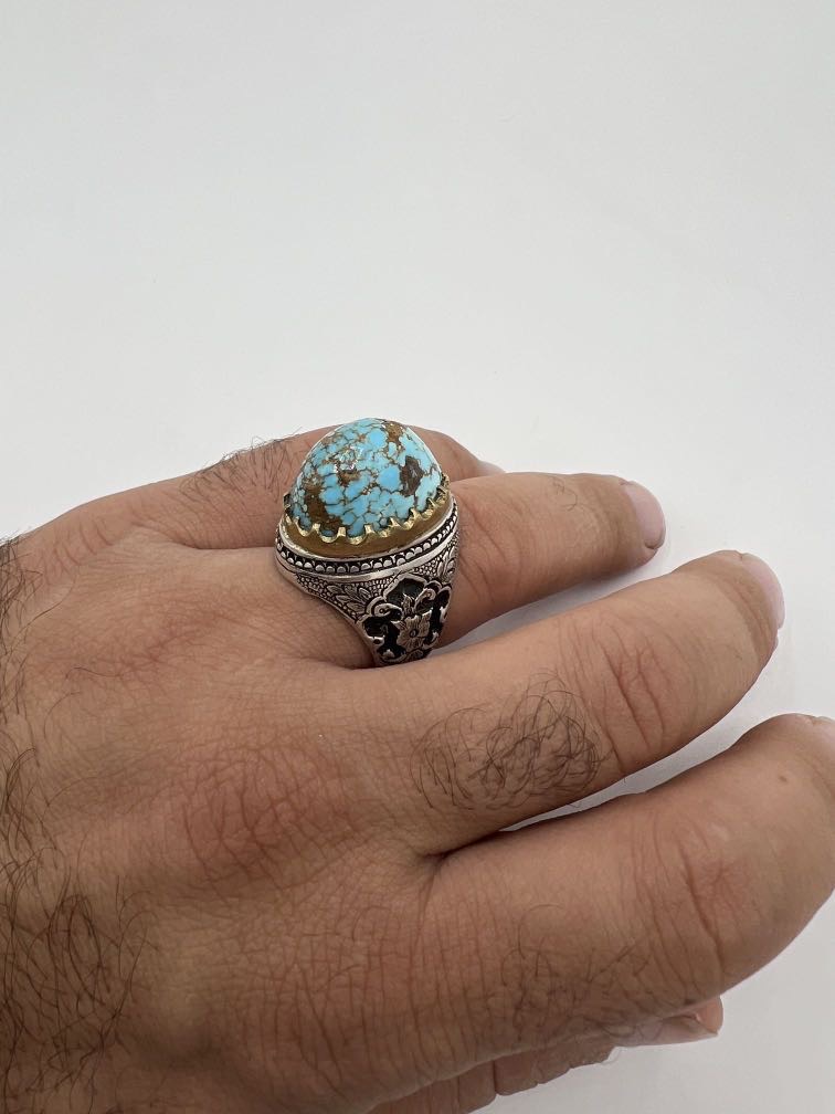 این انگشتر فیروزه با ساخت دقیق و نگین دامله ای ، نمای عالی داخل دست داره