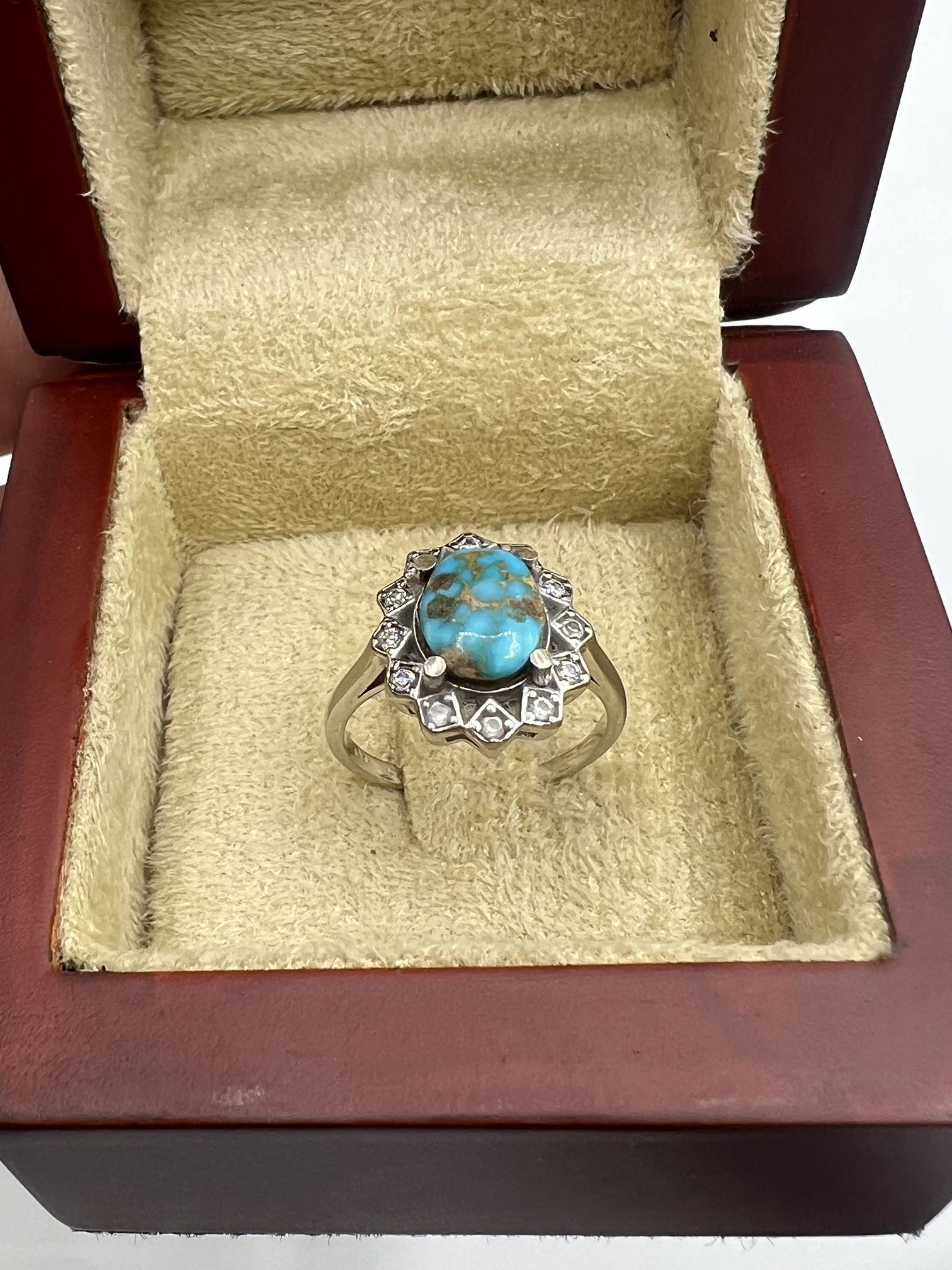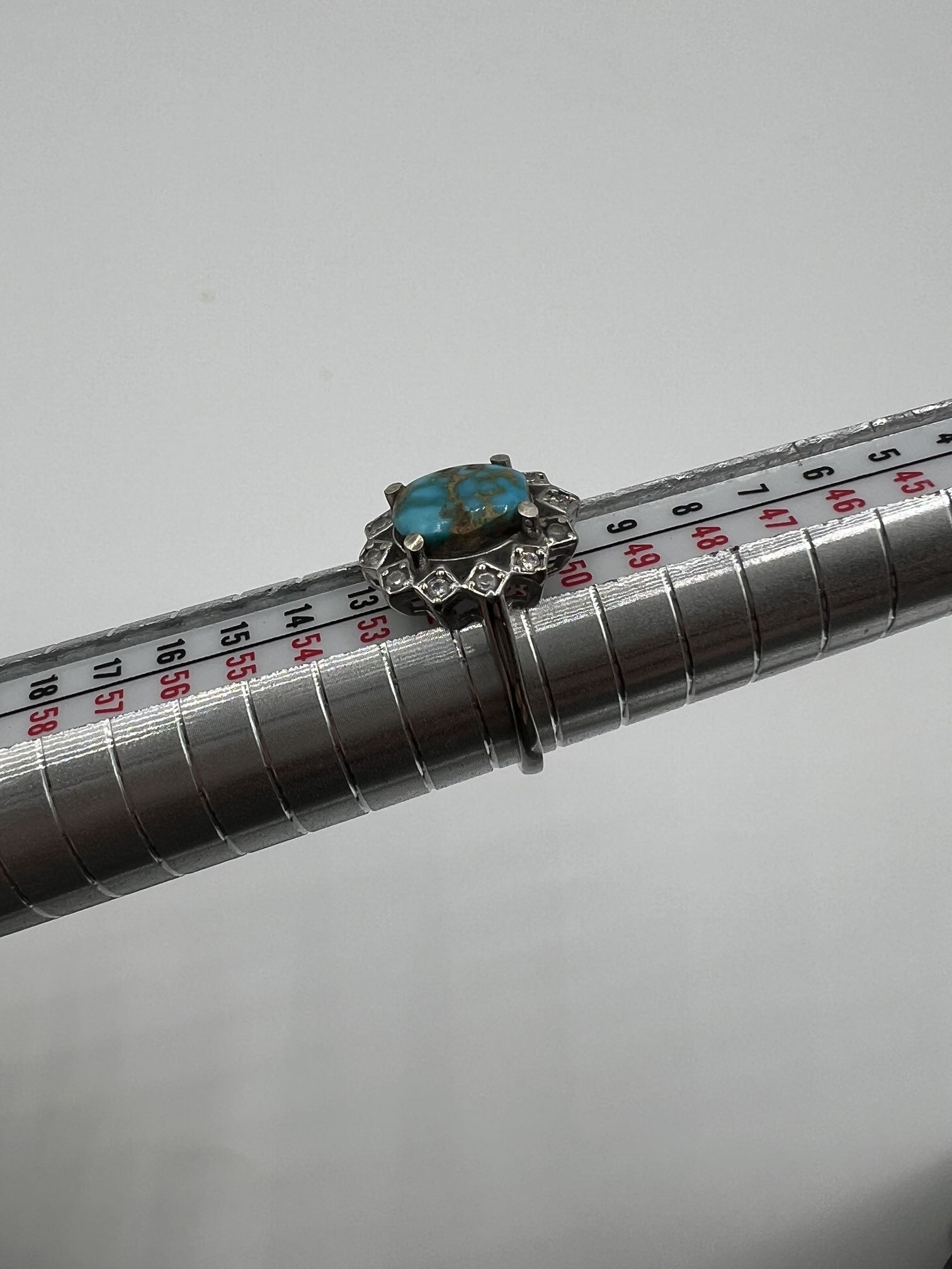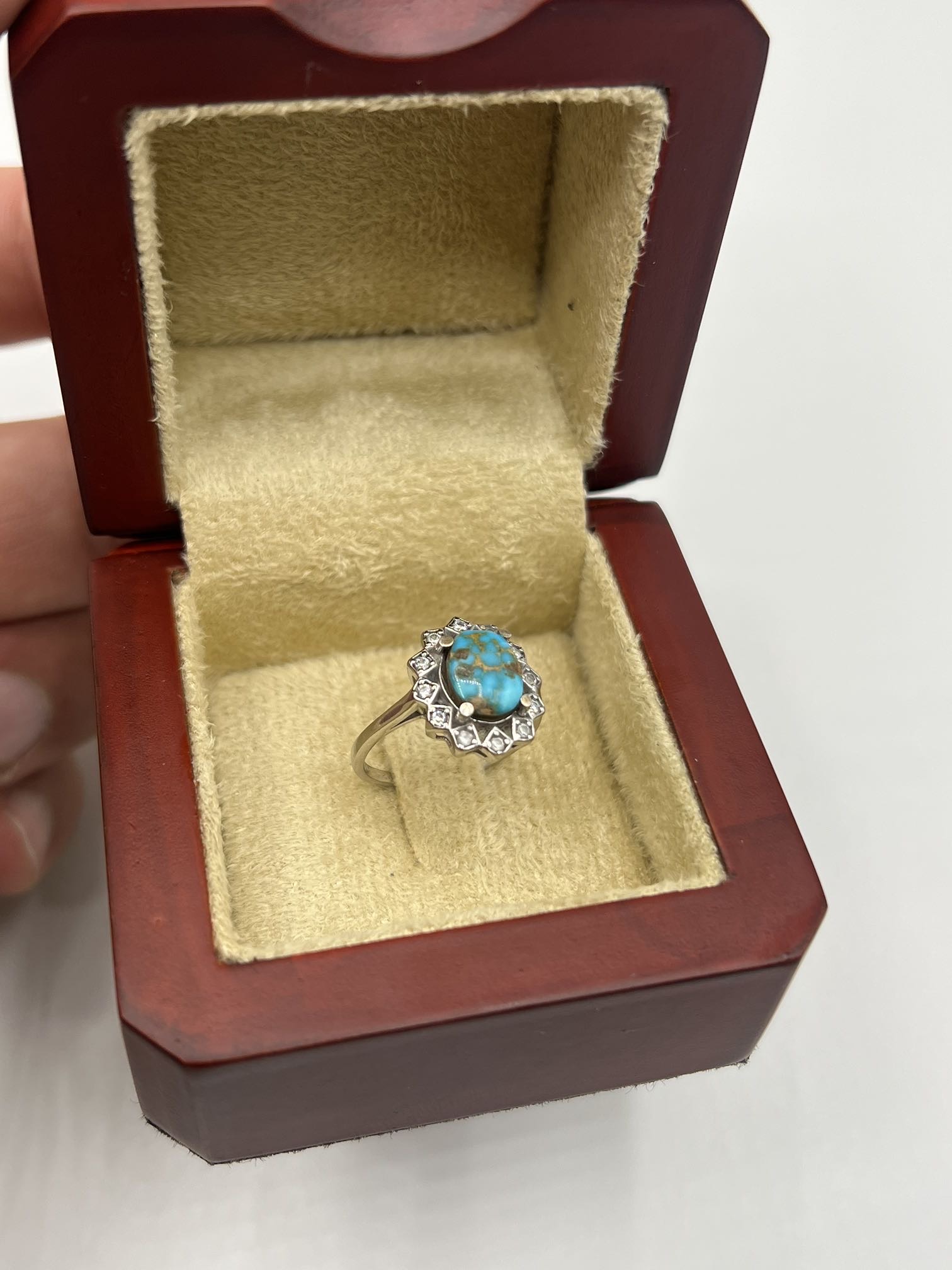 انگشتر فیروزه خوشرنگ رو مشاهده میکنید که دارای رکاب نقره عیار بالا میباشد ، این اثر با رنگ جذاب نگین و رکاب مخراجکاری شده نمای بسیار زیبایی دارد،