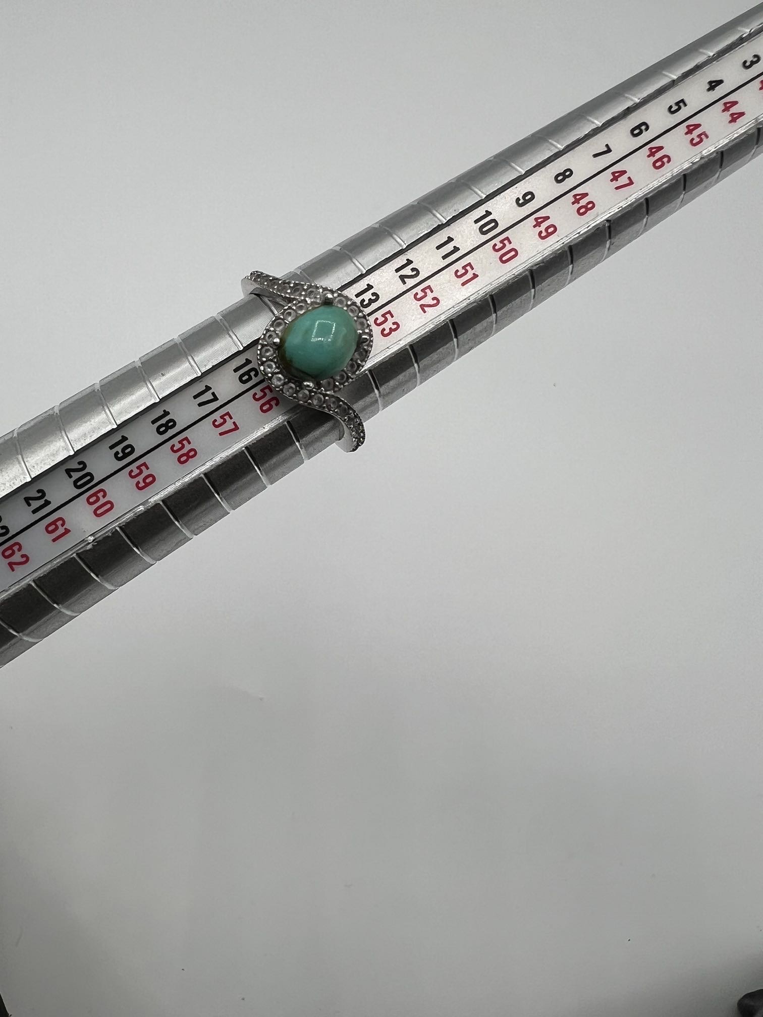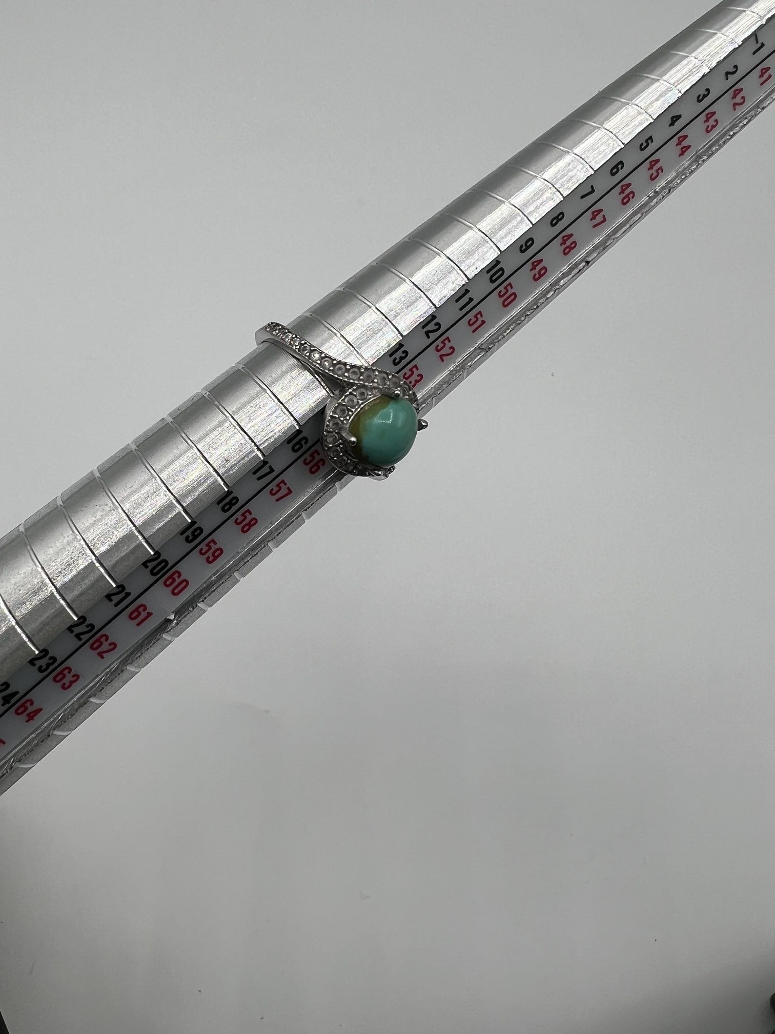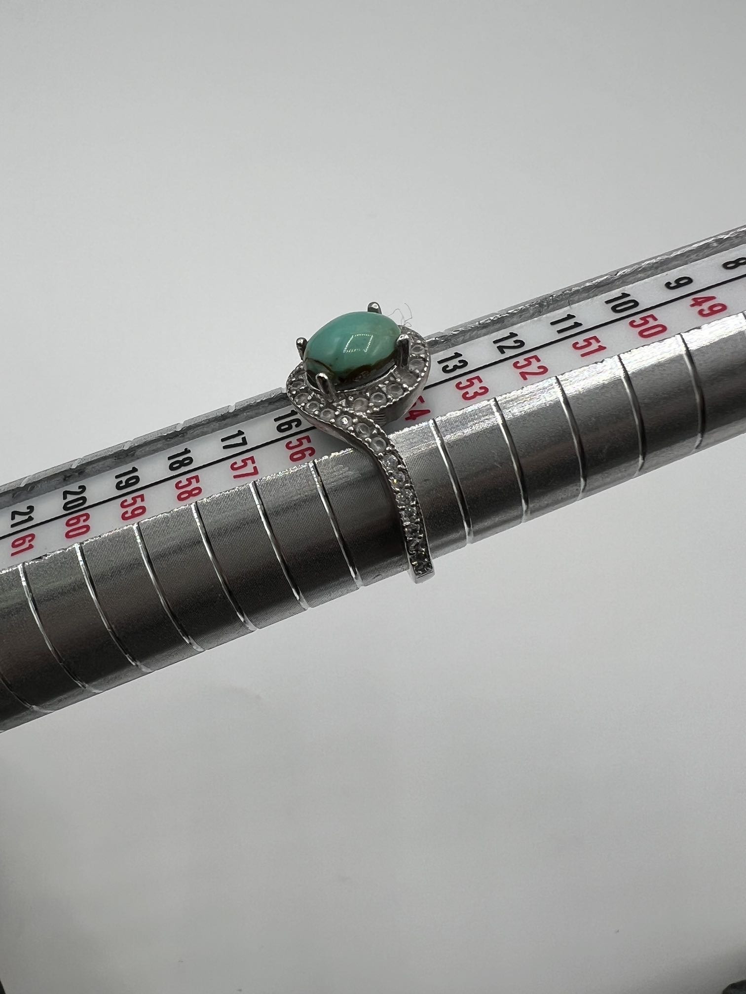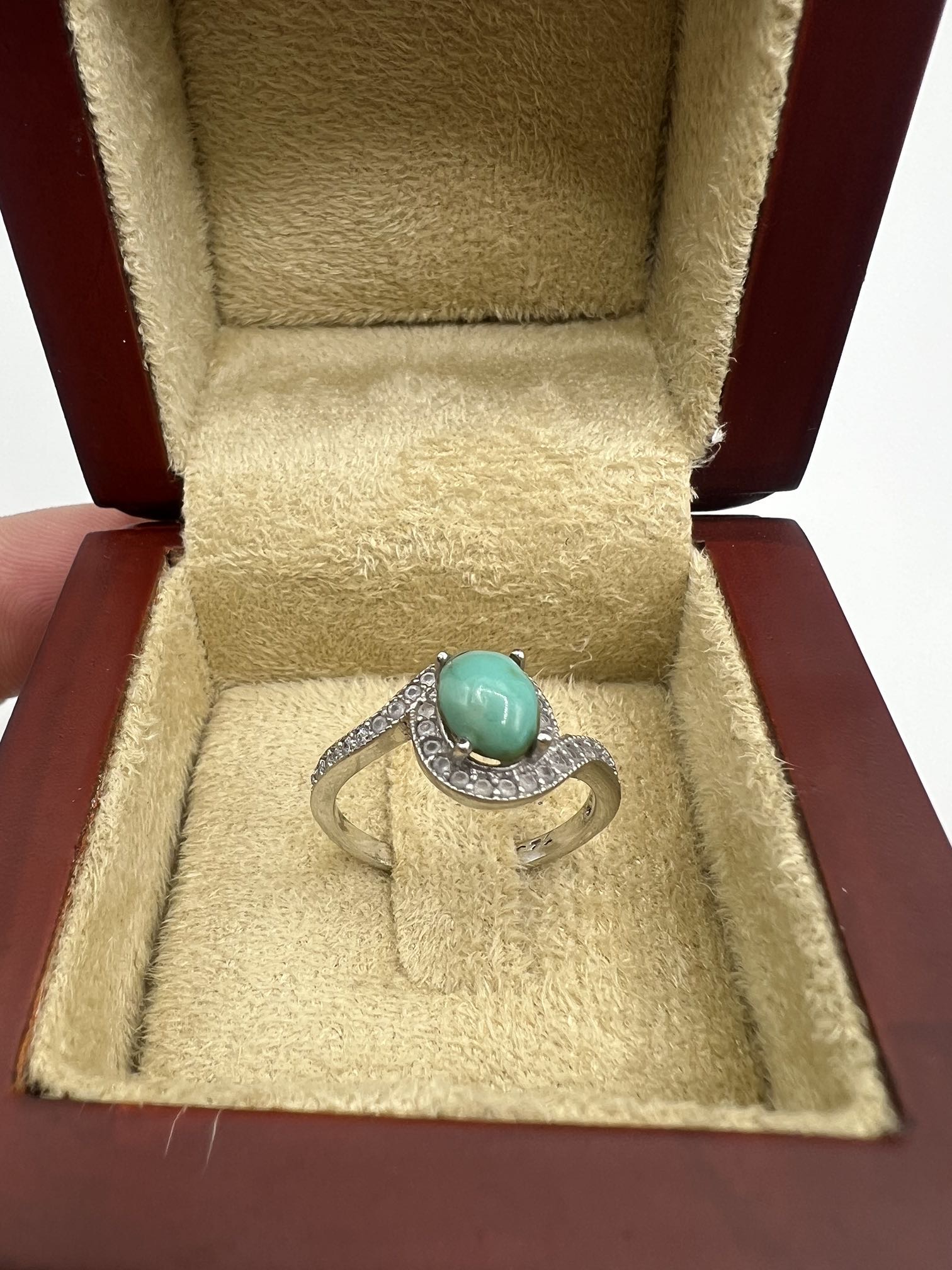 انگشتر طرح موج گالری غدیر با فیروزه خوشرنگ رو مشاهده میکنید که دارای رکاب نقره عیار بالا میباشد ، این اثر با رنگ جذاب نگین و رکاب مخراجکاری شده نمای بسیار زیبایی دارد،