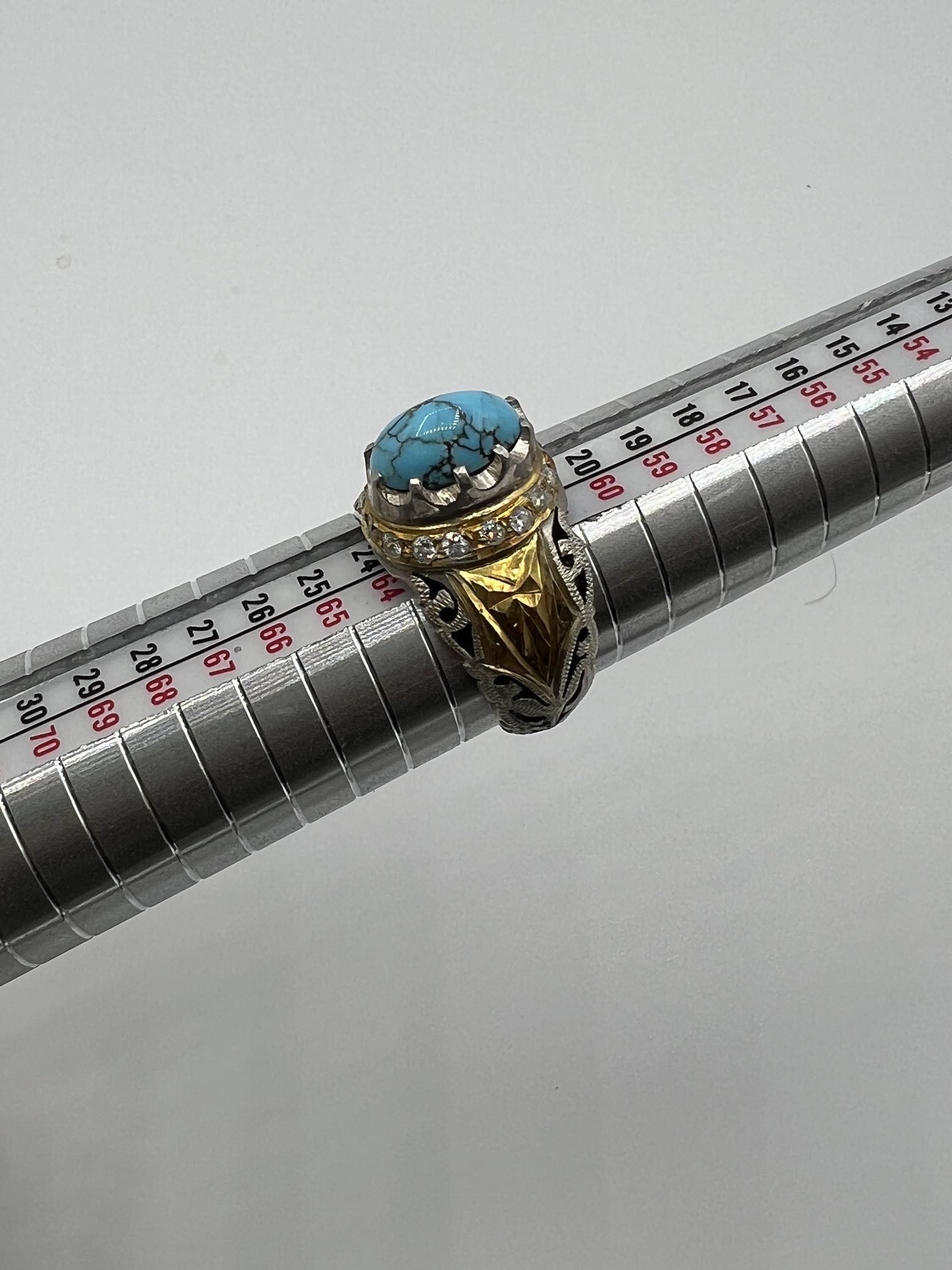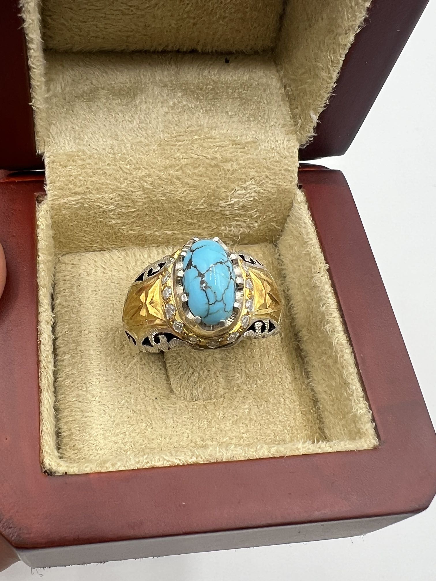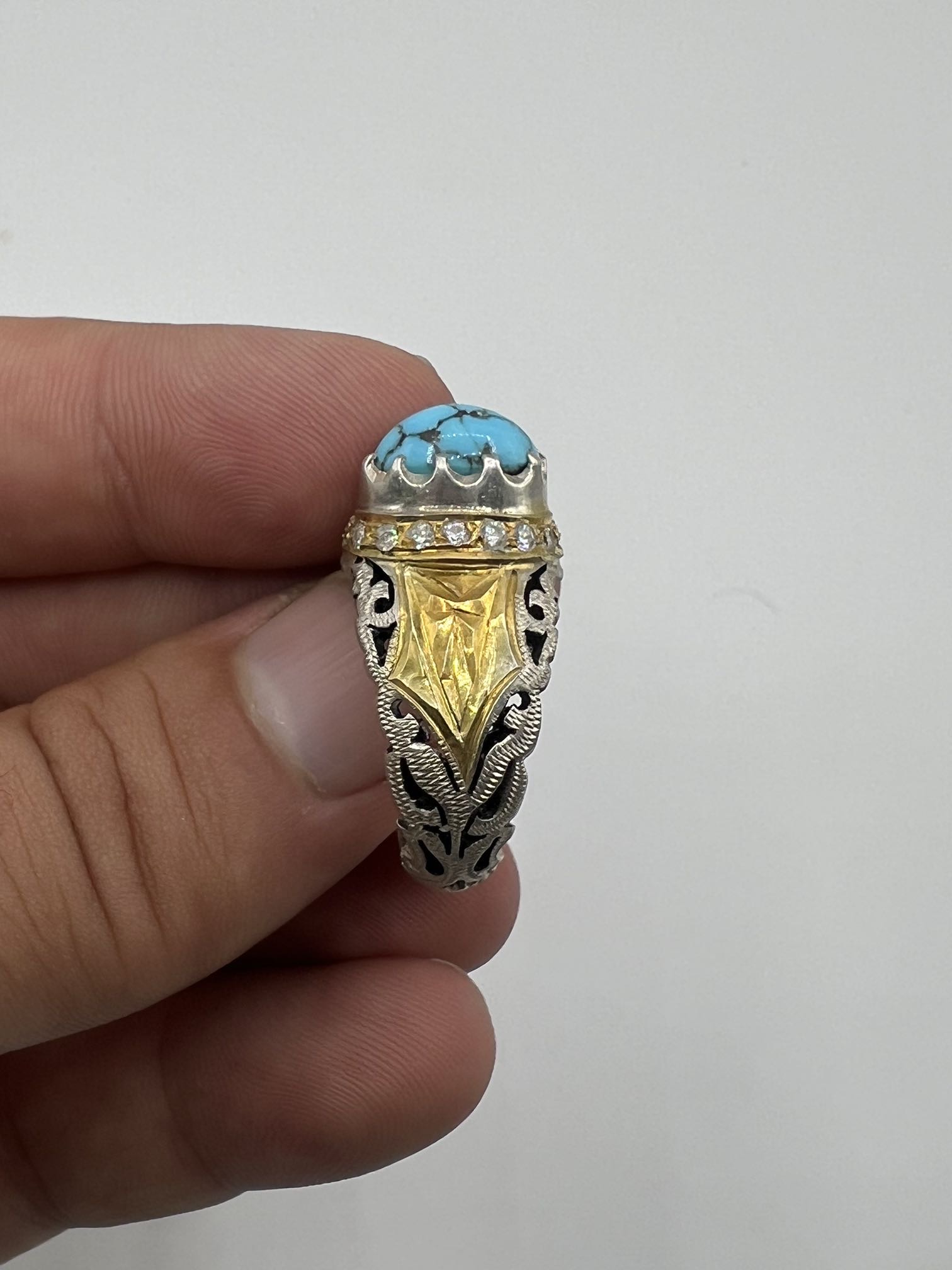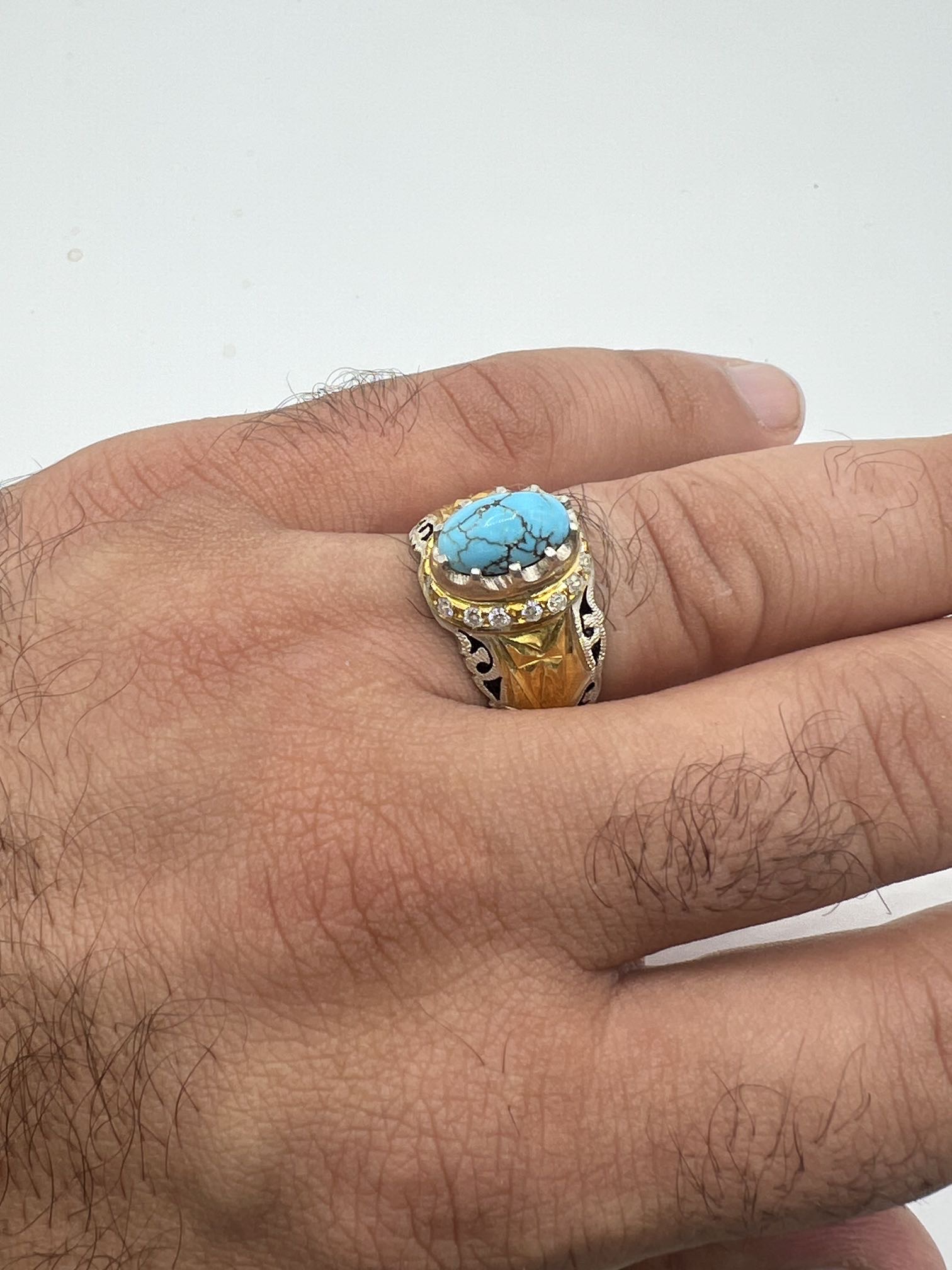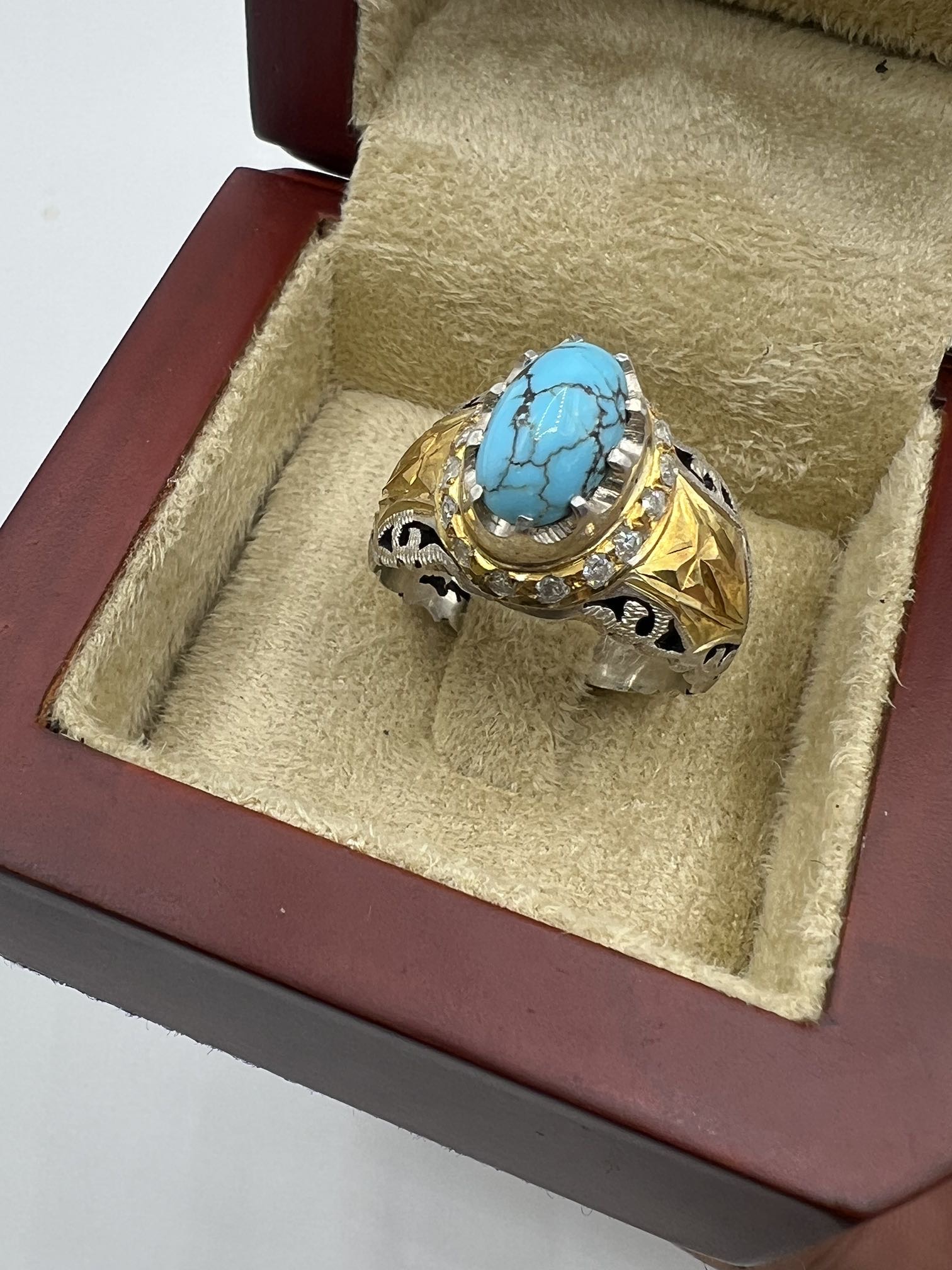 این انگشتر فیروزه با ساخت دقیق و نگین دامله ای ، نمای عالی داخل دست داره بخصوص که رنگ زرد رکاب در کنار رنگ آبی فیروزه بشدت ترکیبی عالی و نمادار رو بوجود آورده اند