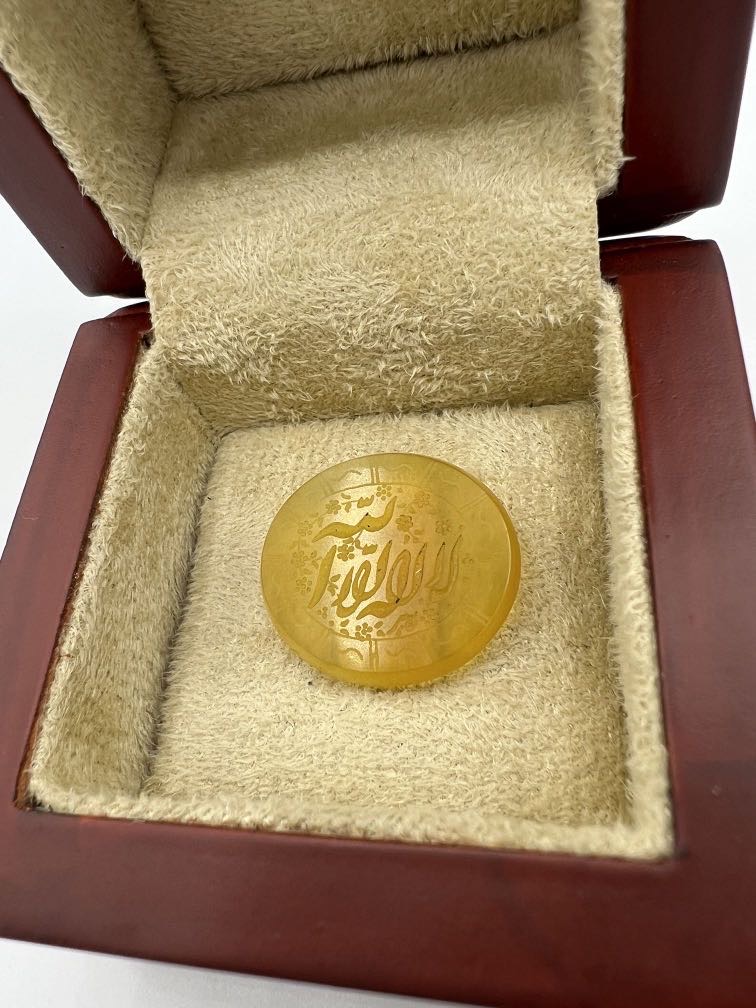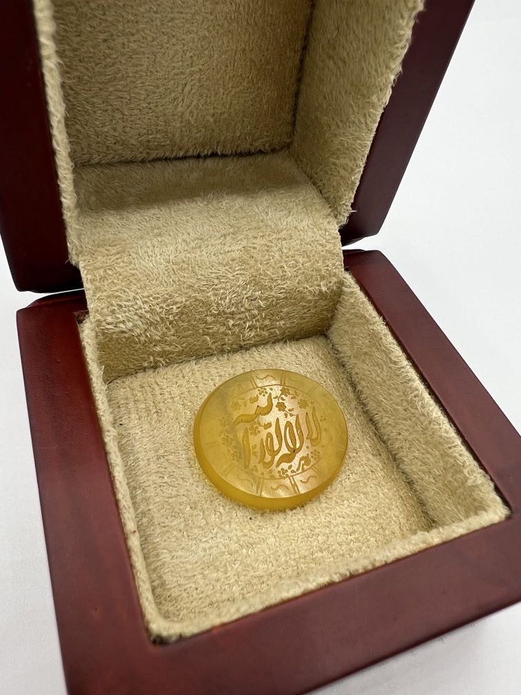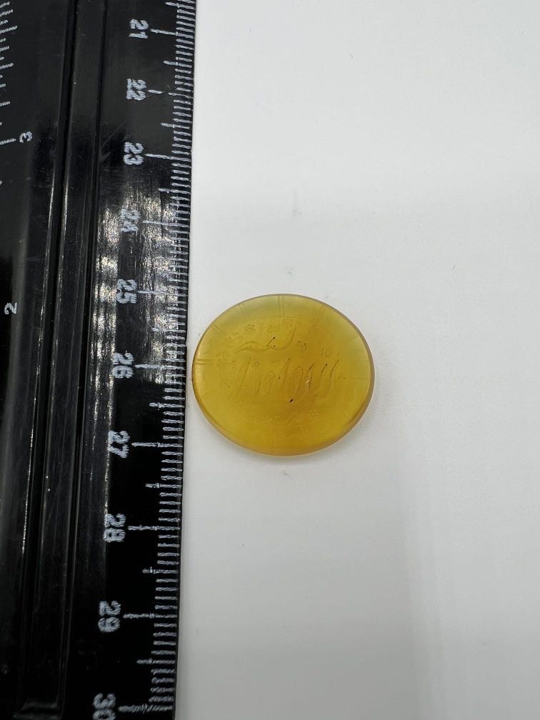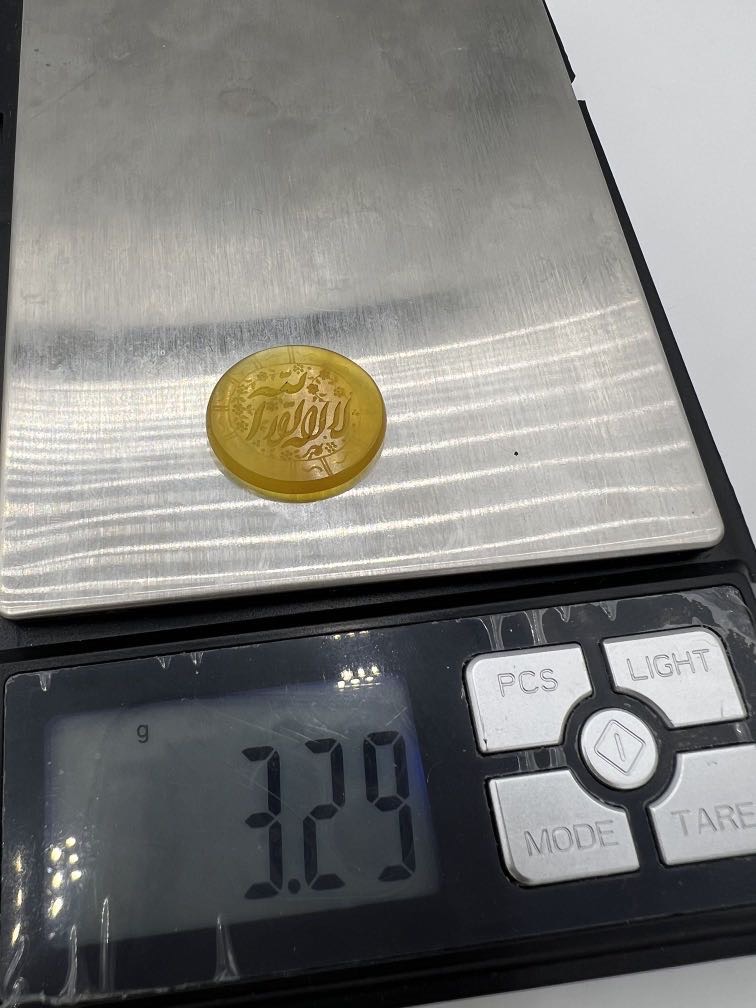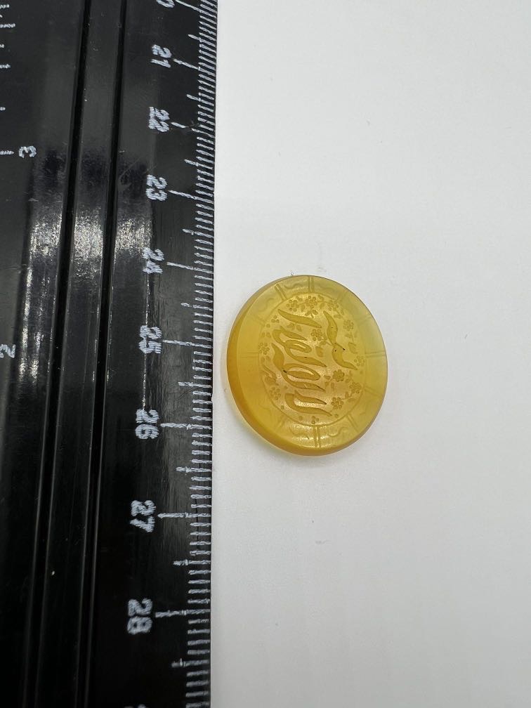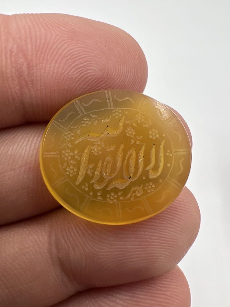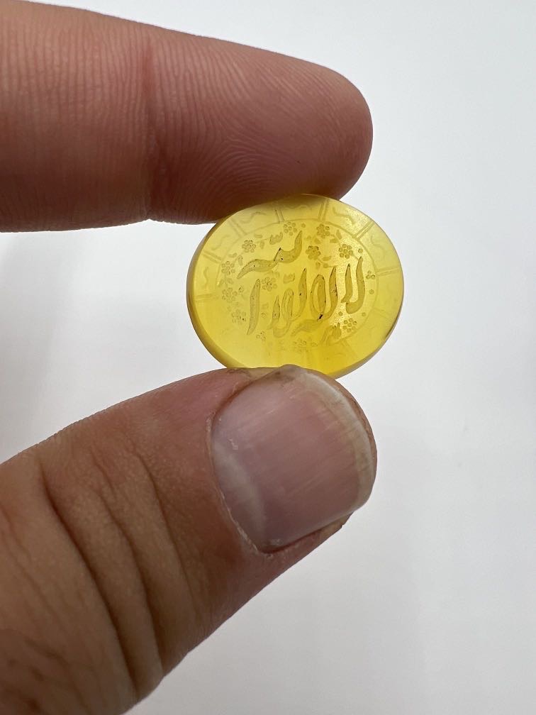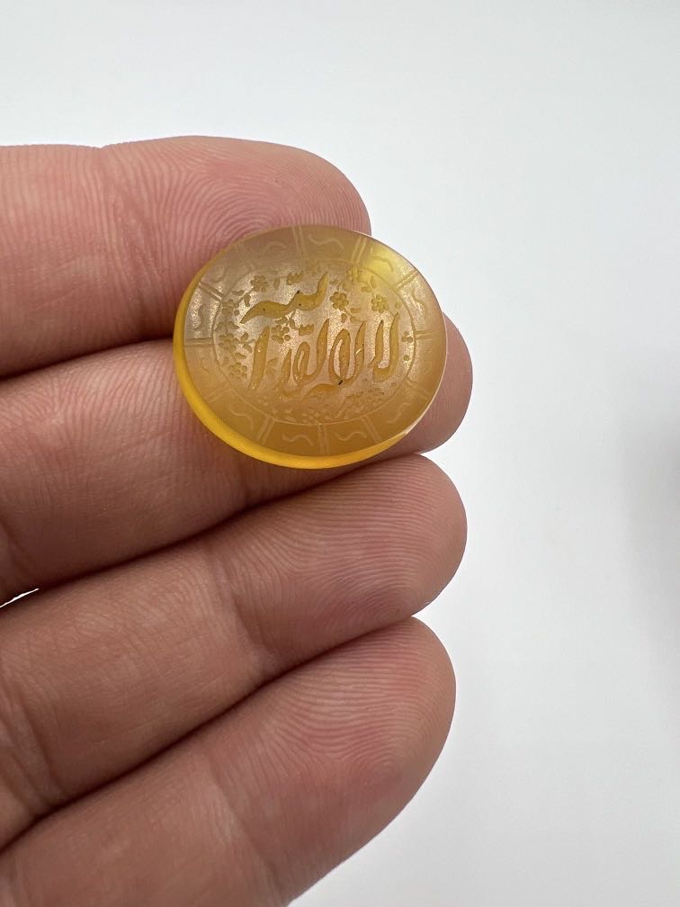 سنگ عقیق زرد خطی با تراش تخت و بیضی و حکاکی زیبای ذکر مقدس لا اله الا الله
