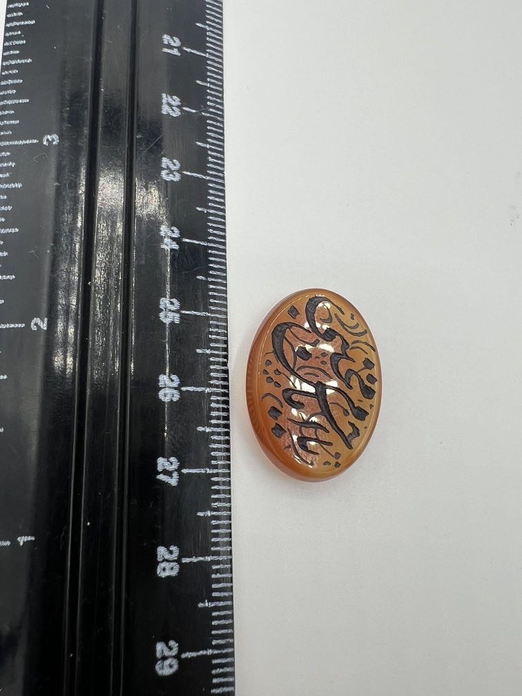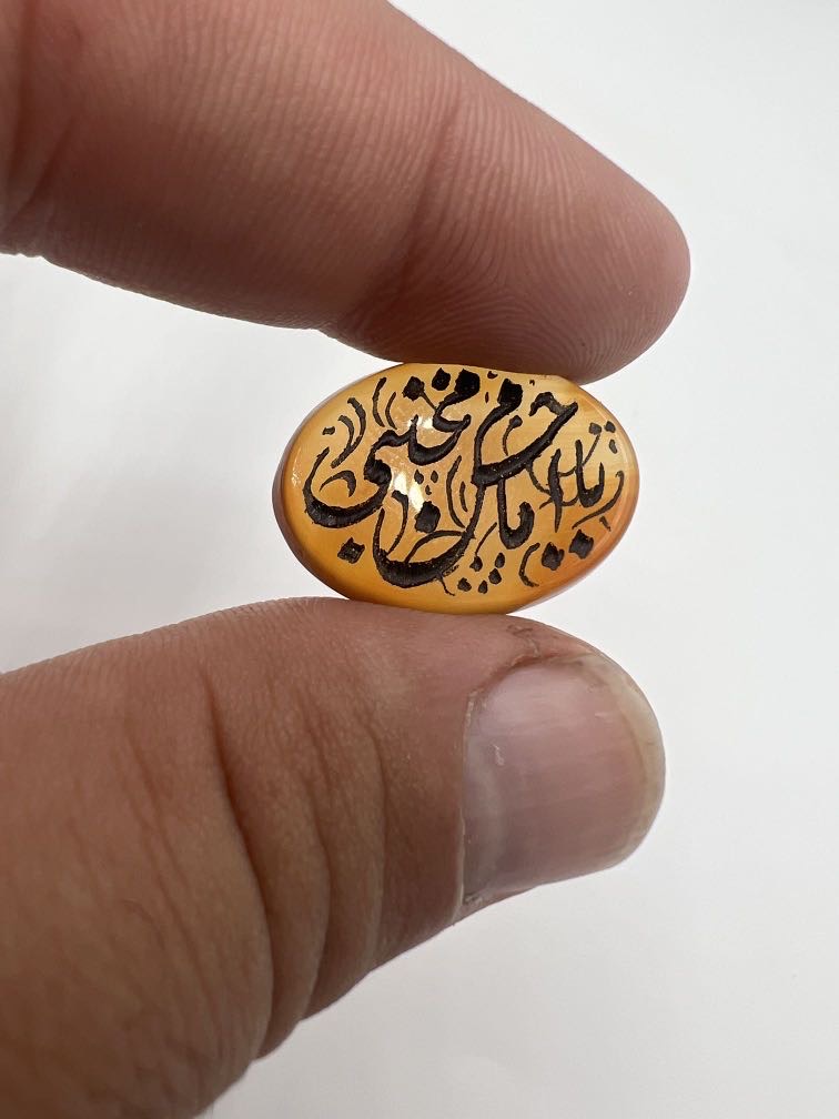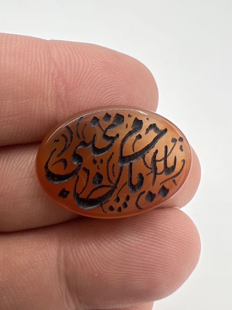 سنگ عقیق سرخ خطی با تراش تخت و بیضی و حکاکی زیبای ذکر مقدس یا امام حسن مجتبی علیه السلام