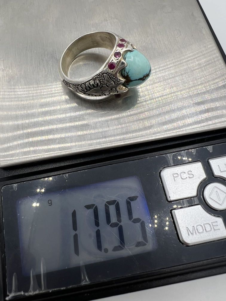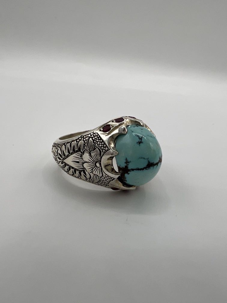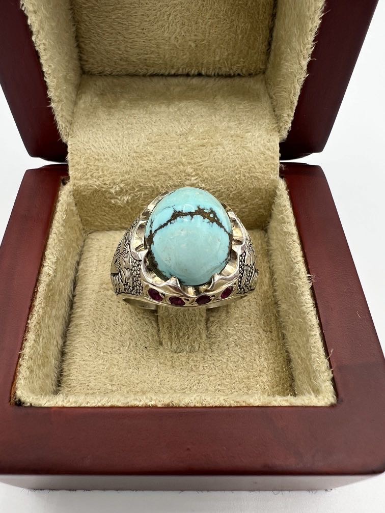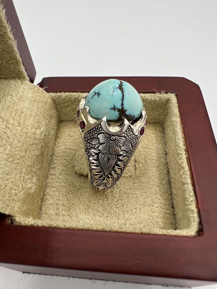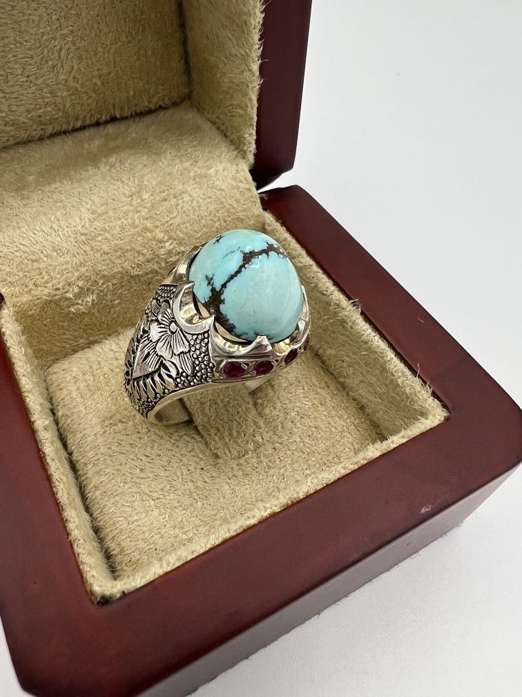 این انگشتر فیروزه با ساخت دقیق و نگین دامله ای ، نمای عالی داخل دست داره بخصوص که چندین نگین ریز سرخ دور نگین کار شده است.